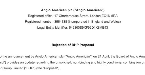 Anglo American respinge offerta di aggregazione di Bhp