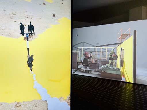 A inaugurare lo spazio una mostra di arte digitale estremamente interessante, che racconta in modo critico il presente tanto quanto simula realtà alternative che partono da condizioni radicalmente diverse dalle nostre, con mondi possibili abitati da orchi o figure non umane. “Theo Triantafyllidis – ha aggiunto Quaranta – è un artista greco che lavora con un mezzo che lui chiama della live simulation: sostanzialmente le animazioni che vediamo non sono dei video, ma sono degli ambienti 3D all’interno dei quali una scena è monitorata da diverse videocamere che si muovono nello spazio. La mostra è intitolata Sisyphean Cycles perché l’intenzione di qui è stata quella di riunire all’interno di questo progetto quattro simulazioni che in modo diverso una dall’altra rappresentano appunto dei cicli di tortura infiniti, ma che possono produrre anche degli effetti positivi come il lavoro principale alle mie spalle, BugSim, che è sostanzialmente un microsistema monitorato dallo spettatore e da una figura aliena”.