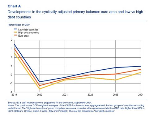 Tuttavia “alcuni governi, nello specifico tra le economie più grandi l’Italia, hanno riportato risultati del 2024 migliori dei nei loro piani per il 2025”. All’opposto “le ultime stime per il deficit in Francia lo pongono sopra il 6% in assenza di misure aggiuntive, sopra quanto precedentemente previsto”, osserva la Bce. (fonte immagine: ECB 2024).