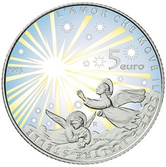 La moneta in argento, versione Fior di Conio, ha un valore nominale di 5 euro e una tiratura di 6.000 pezzi. Sul rovescio, rappresentazione del Paradiso con il cielo, il sole e le stelle su cui si evidenzia, sopra un tetto di nuvole, un particolare degli “Angeli del Paradiso”, affresco di Giotto realizzato nella Cappella degli Scrovegni di Padova; nel giro, il verso “L’AMOR CHE MOVE IL SOLE E L’ALTRE STELLE” che chiude la Cantica del Paradiso. A destra, il valore “5 EURO”; a sinistra “2023”, anno di emissione della moneta; in basso, la “R”, identificativo della Zecca di Roma e la firma dell’autore “MOMONI”. La presenza di elementi colorati caratterizza la versione in argento.