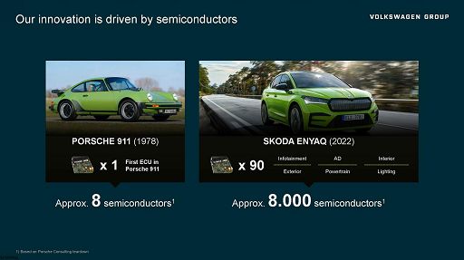 “Questo approccio sarà esteso a tutti i Brand del Gruppo attraverso un apposito Comitato, il Semiconductor Sourcing Committee (SSC), che include rappresentanti dei reparti Acquisti e Sviluppo dei brand Volkswagen e di Cariad”, afferma Karsten Schnake, a capo della task force, trasversale a tutti i brand, Compass (Cross Operational Management Parts & Supply Security), istituita nel 2022 per garantire le forniture e ottimizzare la produzione. Il forte aumento della domanda di semiconduttori è legato all’elettrificazione dei veicoli e all’aumento delle funzioni di assistenza alla guida. Nel 1978, nella centralina di una Porsche 911 erano installati 8 semiconduttori. Oggi, una Skoda Enyaq ha 90 centraline, per un totale di circa 8mila componenti elettronici. Fra le conseguenze c’è l’aumento del costo dei componenti elettronici per veicolo, che entro il 2030 sarà più che raddoppiato rispetto all’attuale media di circa 600 euro. Anche il peso del settore automotive come cliente dell’industria dei semiconduttori è in crescita. Oggi, il settore è al quinto posto tra i principali acquirenti, con un volume di acquisti globali di semiconduttori pari a circa 47 miliardi di dollari. Entro il 2030 si prevede che salirà al terzo posto, con un volume di mercato di circa 147 miliardi di dollari.