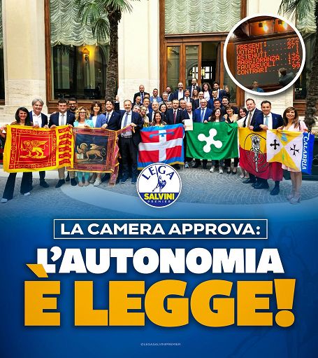 Autonomia, Salvini: è legge, giornata stiorica per l’ItaliaRoma, 19 giu. (askanews) – “Per un’Italia più efficiente e più moderna, con meno sprechi e più servizi a tutti i cittadini, da Nord a Sud: dopo tanti anni di battaglie e di impegno, nonostante le bugie e gli attacchi della sinistra, grazie alla Lega ed al governo l’Autonomia richiesta da milioni di Italiani è stata approvata questa mattina anche alla Camera ed è finalmente legge. Una vittoria di tutti gli italiani: GRAZIE a tutti!”Lo afferma il vicepremier Matteo Salvini, segretario della Lega, postando il festeggiamento della Lega con le bandiere delle Regioni fuori da Montecitorio, dopo il sì definitivo del Parlamento all’Autonomia regionale differenziata.
