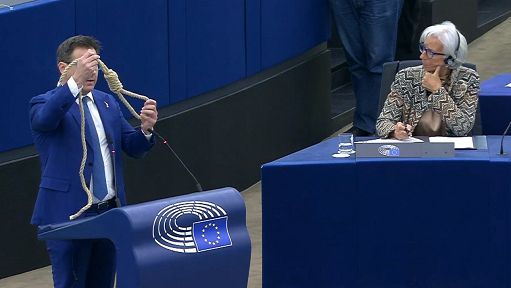 “Le politiche criminali di questa Europa da lei guidata hanno lo stesso effetto di questo cappio”, ha detto Ciocca, sventolando una corda con un cappio che ha estratto dalla giacca, di fronte a una Lagarde impassibile. Cappio “che strangola la gente, che strangola le famiglie, le imprese e la nostra economia. Fermiamo l’aumento dei tassi di interesse, abbassiamo i tassi di interesse”. Altre contestazioni, da vari eurodeputati, hanno riguardato le recenti dichiarazioni di Frank Eldersom, componente del Comitato esecutivo della Bce, contro il personale non allineato con le policy climatiche dell’istituzione.