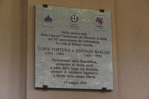 Loris Fortuna, partigiano ed esponente del Partito Socialista Italiano, fu il fondatore e il presidente della Lega Italiana per l’Istituzione del Divorzio insieme con Antonio Baslini, consigliere comunale di Milano per il Partito Liberale. Entrambi deputati, furono i primi firmatari della proposta di legge unificata per la disciplina del divorzio, che prese il loro nome. La targa è stata collocata presso il palazzo storico di Porta Vigentina che, per dieci anni fra il 1960 e il 1970, ospitò la sede della sezione milanese della Lega per l’Istituzione del Divorzio in Italia.