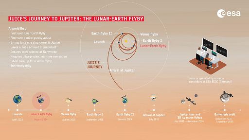 Dopo il lancio della missione nell’aprile del 2023, il Lega del mese prossimo è il primo passo di Juice nella danza verso il sistema di lune gioviano, che dista in media “solo” 800 milioni di km dalla Terra. Senza la sequenza di flyby previsti, il viaggio di Juice verso Giove richiederebbe un’impossibile quantità di propellente a bordo, circa 60mila kg. Quindi la sonda spaziale ha preso la “strada panoramica”, utilizzando la gravità di altri pianeti per regolare con cura la sua traiettoria attraverso lo spazio e assicurarsi di arrivare a Giove con la giusta velocità e direzione. Questo percorso incredibilmente complesso e in continuo mutamento è stato pianificato con cura dal team dedicato all’analisi della missione di Juice negli ultimi 20 anni. In modo controintuitivo, utilizzare la fionda gravitazionale Luna-Terra per rallentare Juice in questo punto del suo viaggio è effettivamente più efficiente che usarlo per accelerarlo. Se si fosse utilizzato questo sorvolo ravvicinato per dare una spinta a Juice verso Marte, avremmo dovuto aspettare a lungo per il successivo flyby planetario. Questa prima manovra di “frenata” è un modo per prendere una scorciatoia attraverso l’attuale Sistema solare interno. Gli operatori della missione hanno già modificato il percorso di Juice per assicurarsi che arrivi il 19 agosto prima alla Luna, e un giorno dopo alla Terra, esattamente al momento giusto, con la velocità e direzione corrette. Sono fiduciosi del successo, ma si tratta di una sfida rischiosa che nessun’altra missione spaziale ha mai affrontato prima. Juice passerà estremamente vicino sia alla Luna che alla Terra, il che significa che è richiesta un’accuratezza millimetrica in tempo reale in tutte le manovre di navigazione. Dal 17 al 22 agosto Juice sarà in continuo contatto con le stazioni terrestri in tutto il mondo. Ogni secondo del tragitto, giorno e notte, gli operatori terranno sotto controllo i dati trasmessi da Juice, apportando eventuali piccoli aggiustamenti necessari per mantenere l’astronave nel giusto percorso.