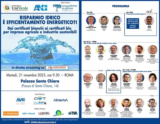 Di questi temi si parlerà al convegno “Risparmio idrico è efficientamento energetico ?! Dai certificati bianchi ai certificati blu per imprese agricole e industria sostenibili”, promosso da Fondazione UniVerde e ANBI con la main partnership di Acquedotto Pugliese, che si terrà martedì 21 novembre, ore 9:30, presso Palazzo Santa Chiara (Piazza di Santa Chiara, 14) a Roma. L’evento è organizzato in collaborazione con gli event partners: AVR federata Anima Confindustria, GMT, Almaviva; e con Italpress, Askanews, La Notizia, TeleAmbiente e TVA in qualità di media partners. IL PROGRAMMA – Dopo l’introduzione di Alfonso Pecoraro Scanio (Presidente della Fondazione UniVerde), Francesco Vincenzi (Presidente di ANBI) e Francesca Portincasa (Direttrice Generale di Acquedotto Pugliese), sarà presentato il position paper di Ref Ricerche su “Risparmio e tutela della risorsa idrica: verso i certificati blu per gli usi industriali” a cura di Samir Traini (Partner di REF Ricerche).