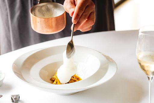 La primavera del Fre porta con sé interessanti novità, nei colori, nelle ispirazioni, nelle fioriture e negli ingredienti, in un menu che coniuga tecniche e filosofie della più alta cucina francese con materie prime del territorio piemontese. Il risultato è una cucina ibrida, nuova, che trova le sue radici al di là delle Alpi ma che rinasce qui sotto una veste diversa e inedita. Una cucina in cui le salse, le garniture, le ricette e le preparazioni incontrano i produttori locali e le migliori eccellenze langarole, come succede ad esempio nella Balade, un’insalata di vegetali in varie consistenze, piatto particolarmente caro allo Chef Alléno, che qui viene riformulata in versione piemontese grazie alle verdure di un giovane contadino locale, che ha messo i frutti del suo orto a disposizione del FRE. A interpretare questa filosofia di cucina c’è, come sempre, il giovane Resident Chef Francesco Marchese, scelto da Chef Alléno nel 2020 per guidare questo progetto gastronomico incastonato nelle colline di Monforte d’Alba. “In questo nuovo menu che dà il benvenuto all’estate abbiamo mantenuto la nostra filosofia, che punta a mantenere lo stile iconico delle ricette di Chef Alléno facendo respirare sempre il terroir di questa zona, con richiami ai prodotti e alla cultura locali”, spiega Marchese.