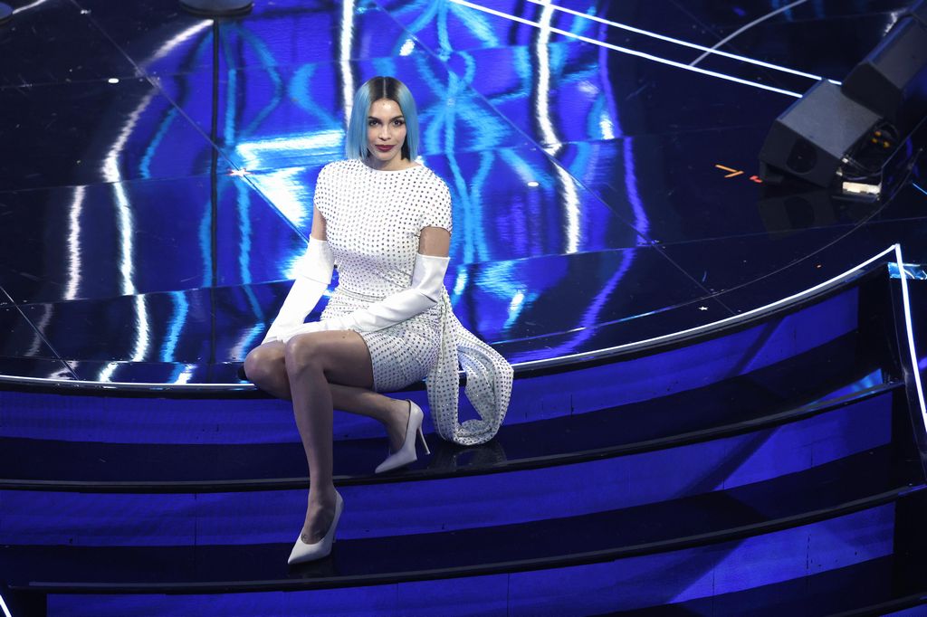 Minigonna, tacchi alti, cravatta allentata su camicia bianca, fiocchetto rosso contro la violenza sulle donne, e capelli azzurri, Loredana ha voluto ringraziare Pippo Balestrieri, direttore del palco dell’Ariston da 41 anni.