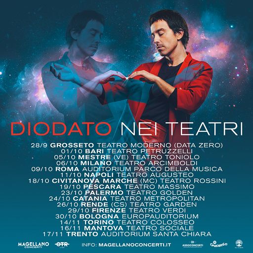 Il tour, prodotto da Magellano Concerti, partirà il 28 settembre da Grosseto (Teatro Moderno – Data zero), per poi proseguire il 1 ottobre a Bari (Teatro Petruzzelli), il 5 ottobre a Mestre (Teatro Toniolo), il 6 ottobre a Milano (Teatro Arcimboldi), il 9 ottobre a Roma (Auditorium Parco Della Musica), l’11 ottobre a Napoli (Teatro Augusteo), il 18 ottobre a Civitanova Marche (Teatro Rossini), il 19 ottobre a Pescara (Teatro Massimo), il 23 ottobre a Palermo (Teatro Golden), il 24 ottobre a Catania (Teatro Metropolitan), il 26 ottobre a Rende (Teatro Garden), il 29 ottobre a Firenze (Teatro Verdi), il 30 ottobre a Bologna (Europaditorium), il 14 novembre a Torino (Teatro Colosseo), il 16 novembre a Mantova (Teatro Sociale) e si concluderà il 17 novembre a Trento (Auditorium Santa Chiara). Biglietti disponibili da martedì 6 febbraio alle ore 16:00 nei circuiti di prevendita abituali. Per info: www.magellanoconcerti.it Cantautore intenso e ricercato tra i più apprezzati del nuovo pop italiano, Diodato torna nel 2024 al Festival di Sanremo con “Ti muovi”, portando sul palco dell’Ariston tutta la sua cifra stilistica, energica, elegante ed unica. Il brano uscirà su tutte le piattaforme digitali nella notte di mercoledì 7 febbraio e sarà accompagnato dal videoclip ufficiale, una rappresentazione del legame indissolubile tra l’emozione e il movimento interiore, che si riflettono anche all’esterno.