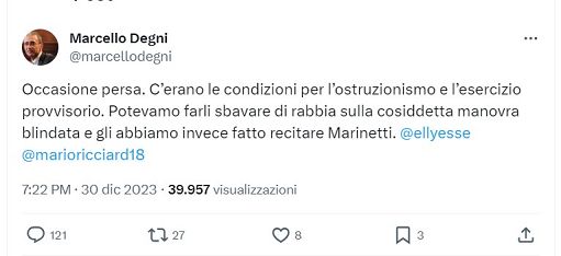 Degni: il mio post? La verità è che il Parlamento non si esprime piùRoma, 3 gen. (askanews) – “Più ci penso e più sento di aver fatto la scelta giusta. Non mi sembra” che il post messo sotto accusa dai partiti di maggioranza “contenesse cose particolari. Ho solo espresso il rammarico perché l’opposizione avrebbe potuto sfruttare di più gli strumenti del diritto parlamentare per marcare meglio la maggioranza sulla manovra”. Così, in un’intervista su ‘La Stampa’, il consigliere della Corte dei Conti, Marcello Degni, il quale in un post su X ha scritto che l’approvazione della manovra è stata “un’occasione persa” perché “c’erano le condizioni per l’ostruzionismo e l’esercizio provvisorio” e perché “potevamo farli sbavare di rabbia sulla cosiddetta manovra blindata e gli abbiamo invece fatto recitare Marinetti”.