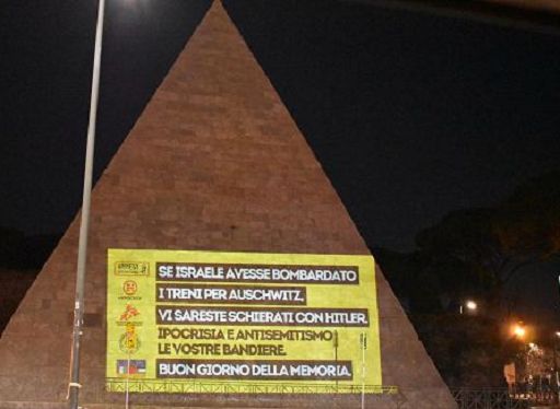 Denuncia su monumenti di Roma: “Da ONG ipocrisia e antisemitismo”Roma, 27 gen. (askanews) – Questa notte, alla vigilia del Giorno della Memoria, è stato proiettato su vari monumenti ed edifici di Roma un provocatorio messaggio di denuncia nei confronti di associazioni e ONG: “Se Israele avesse bombardato i treni per Auschwitz, vi sareste schierati con Hitler. Ipocrisia e antisemitismo le vostre bandiere. Buon giorno della memoria”, si legge, con accanto i simboli di varie ONG tra cui Amnesty International, Emergency e Medici senza Frontiere.