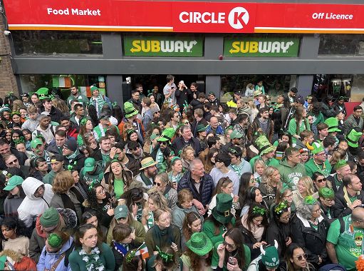 Da nord a sud il grande corteo scivola lungo le vie di Dublino, con partecipanti che vengono dall’Europa e dall’America, e naturalmente non può mancare proprio San Patrizio, forse più mondano di come ce lo saremmo aspettati. “Quest’anno è la parata più grande e più bella di sempre – ci ha detto – ma io sono sempre lo stesso, le stesse battute, gli stessi gossip”, e poi via verso un altro abbraccio della folla. Per strada volti di ogni etnia, cappelli vistosi, bandiere e travestimenti vari. E poi canti, balli, persone affacciate alle finestre o addirittura arrampicate fuori dai pub, per poter dire anche nel 2024: “Io c’ero”. Così come c’erano le bandiere e messaggi per la Palestina, che qualcuno ha voluto ricordare anche nel giorno di festa.