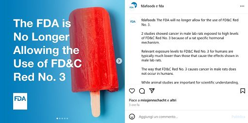 Il colorante è presente in caramelle, cereali, ciliegie dei cocktail di frutta e frullati alla fragola, secondo il Center for science in the public interest, un gruppo di difesa della sicurezza alimentare che dal 2022 ha lavorato per far revocare l’approvazione dell’additivo. I produttori di alimenti avranno tempo fino al 15 gennaio 2027 per riformulare i loro prodotti. Le aziende che producono farmaci e integratori alimentari, avranno tempo fino al 2028. (foto tratta dai canali social Fda)