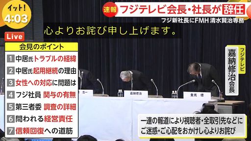Lo stesso primo ministro giapponese Shigeru Ishiba è dovuto intervenire sulla questione alla Camera dei rappresentanti, annunciando che “il Ministero delle Comunicazioni ha chiesto a Fuji TV di avviare rapidamente un’indagine attraverso un comitato indipendente e di intraprendere azioni adeguate basate sui risultati” dell’indagine. Oggi Fuji TV ha tenuto un’ulteriore conferenza stampa, nella quale è stato annunciato che il presidente Koichi Minato e il presidente del Consiglio d’Amministrazione Shuji Kano si dimettono con effetto immediato, assumendosi la responsabilità della vicenda. Hanno presentato le rituali scuse, inchinandosi all’opinione pubblica.