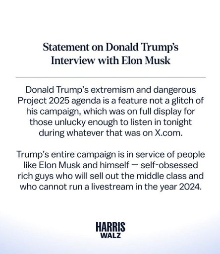 “L’estremismo di Donald Trump e la sua pericolosa agenda Prject 2025 sono la caratteristica, non il difetto della sua campagna presidenziale e, ora, sono stati pienamente mostrati a quelli che hanno avuto la sfortuna di ascoltarlo stasera durante quello che è accaduto su X.com”, ha scritto la campagna in un comunicato pubblicato anche su X. “L’intera campagna di Trump è al servizio di gente come Elon Musk e di sé stesso. I ricchi, ossessionati da sé stessi, che schiacciano la classe medio e che non sono neanche capaci di gestire un livestream nell’anno 2024”, continua il comunicato, facendo riferimento al ritardo nella trasmissione dell’intervista, attribuito da Musk a un attacco informatico.