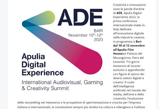 Media, al via oggi a Bari l’Apulia Digital ExperienceRoma, 10 nov. (askanews) – Creatività e innovazione sono le parole d’ordine di ADE, Apulia Digital Experience 2023, la prima conferenza internazionale made-in-Italy dedicata all’innovazione digitale nelle industrie creative. I lavori hanno preso il via oggi e termineranno domenica. Tre giorni immersivi di incontri esclusivi e approfonditi con figure di spicco dei diversi settori digitali e creativi.