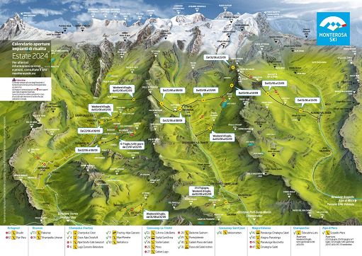Lato Frachey, le seggiovie Alpe Mandria (9) e Bettaforca (10) saranno aperte tutti i weekend di luglio e continuativamente dal 1 agosto al 1 settembre. Anche a Estoul, a monte del villaggio di Brusson, si salirà in quota con la seggiovia Palasinaz (73) che sarà aperta tutti i weekend di luglio e ogni giorno dal 1 agosto al 1 settembre. Valsesia Oltre alle tratte Alagna-Pianalunga (42) e Pianalunga-Cimalenga-Salati (41) che saranno attive tutti i giorni dal 1 giugno al 15 settembre, in Valsesia sarà aperta per tutti i weekend a partire dal 22-23 giugno la seggiovia Scopello-Alpe di Mera (51), che resterà in servizio continuativo tutti i giorni dal 20 luglio al 1 settembre e per il fine settimana del 7-8 settembre.