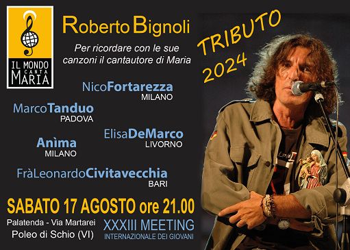 Musica cristiana, “Il mondo canta Maria” omaggia Roberto BignoliRoma, 13 ago. (askanews) – Si terrà sabato 17 agosto alle ore 21,00 presso il palatenda del Meeting dei Giovani a Schio (VI) la tappa del Tour 2024 “Il mondo canta Maria”, con il secondo tributo in ricordo dell’artista Roberto Bignoli, scomparso nel 2018.