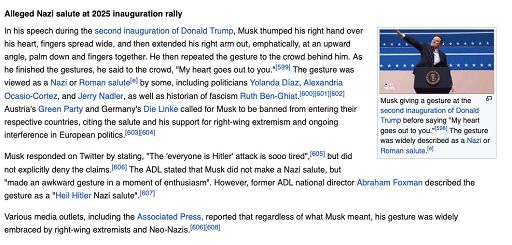 “Durante il discorso per la seconda inaugurazione di Donald Trump, Elon Musk ha battuto la mano destra sul petto, con le dita aperte, per poi estendere il braccio destro in avanti con decisione, ad un angolo verso l’alto, con il palmo rivolto verso il basso e le dita unite. Ha poi ripetuto il gesto verso la folla dietro di lui. Terminando i gesti, ha detto alla folla: ‘Il mio cuore è con voi’”, scrive la pagina biografica di Musk su Wikipedia. “Il gesto – continua – è stato interpretato come un saluto nazista o romano da alcuni, tra cui i politici Yolanda Díaz, Alexandria Ocasio-Cortez e Jerry Nadler, oltre che dalla storica del fascismo Ruth Ben-Ghiat”. Ma l’enciclopedia online specifica anche che Musk ha negato di aver avuto intenzione di fare un saluto nazista.Musk – a quanto riferisce l’agenzia di stampa France Presse – ha accusato Wikipedia di diffondere la “propaganda” dei media tradizionali e ha anche invitato i suoi sostenitori a non finanziare più Wikipedia.