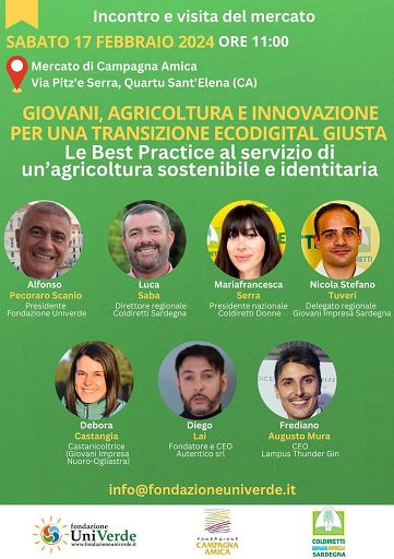 All’evento, insieme al Presidente della Fondazione UniVerde, Alfonso Pecoraro Scanio, interverranno: Luca Saba (Direttore regionale Coldiretti Sardegna); Mariafrancesca Serra (Presidente nazionale Coldiretti Donne); Nicola Stefano Tuveri (Delegato regionale Giovani Impresa Sardegna); Debora Castangia (Castanicoltrice, Giovani Impresa Nuoro-Ogliastra); Diego Lai (Fondatore e CEO Autentico Srl); Frediano Augusto Mura (CEO Lampus Thunder Gin).