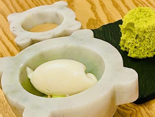 Quel dolce al pesto sintesi della cucina ambiziosa di Equilbrio a ImperiaMilano, 8 ott. (askanews) – Un dolce al pesto, con cremoso al basilico e un gelato al pinolo tostato, sul quale, per i più audaci, lo chef consiglia una spolverata di parmigiano. C’è un po’ tutta la cucina di Jacopo Chieppa in questo piatto servito in un mortaio di marmo: la rielaborazione della tradizione ligure, la creatività e la sfrontatezza di un giovane chef di 32 anni che, schiettamente, confessa di puntare alla prima stella Michelin per il suo ristorante ‘Equilibrio’ aperto poco più di un anno fa a Dolcedo, nell’entroterra di Imperia, ma già segnalato nella Guida Rossa.