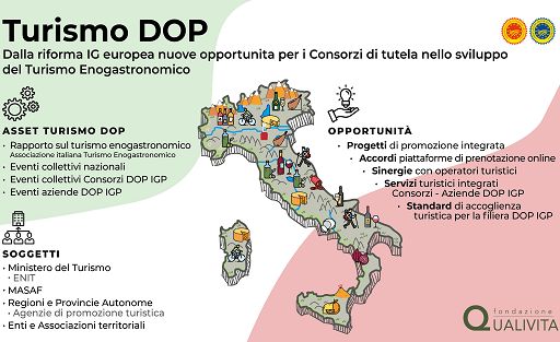 Per quanto riguarda il settore specifico DOP IGP, l’Osservatorio Qualivita, solo nel 2022, ha contato “oltre 230 eventi organizzati dai Consorzi di tutela fra degustazioni, visite outodoor, festival e iniziative che hanno risposto alla richiesta dei cittadini di esperienze vere nei territori del cibo e del vino”. A questo aspetto, sempre secondo la Fondazione, “si aggiungono numerosi elementi positivi legati al coordinamento dei Consorzi di tutela: dalla formazione di un consumatore consapevole attraverso attività esperienziali, capaci di trasferire tutti i valori della filiera come il ‘saper fare’, i fattori ambientali, il patrimonio artistico e culturale o quello storico e sociale fino all’introduzione di una gestione sostenibile coordinata sul territorio in grado di salvaguardare le risorse naturali degli areali”.